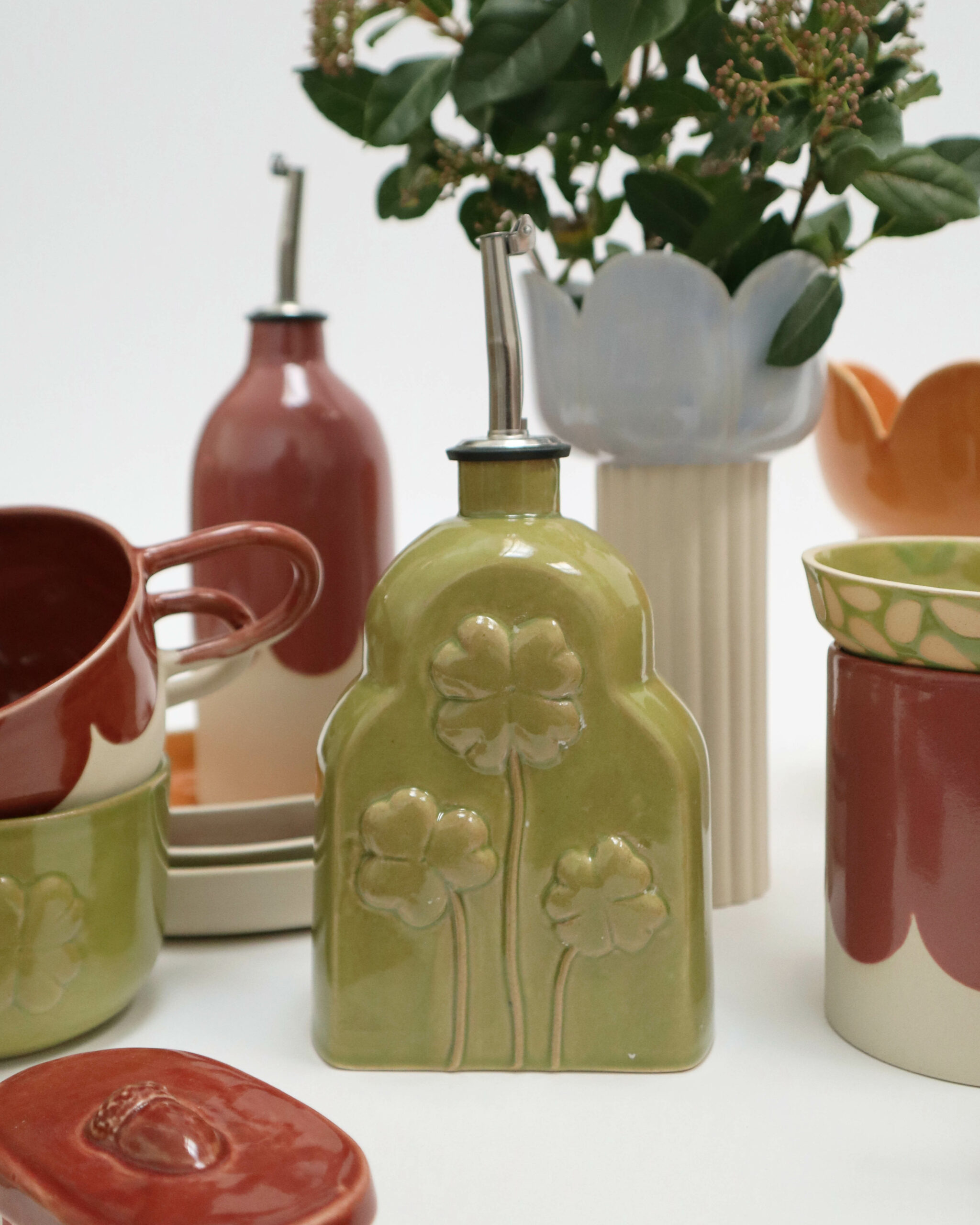 Ce flacon à huile mêle douceur des formes et fonctionnalité, pour sublimer les gestes simples en cuisine et accompagner vos plus belles tablées estivales.