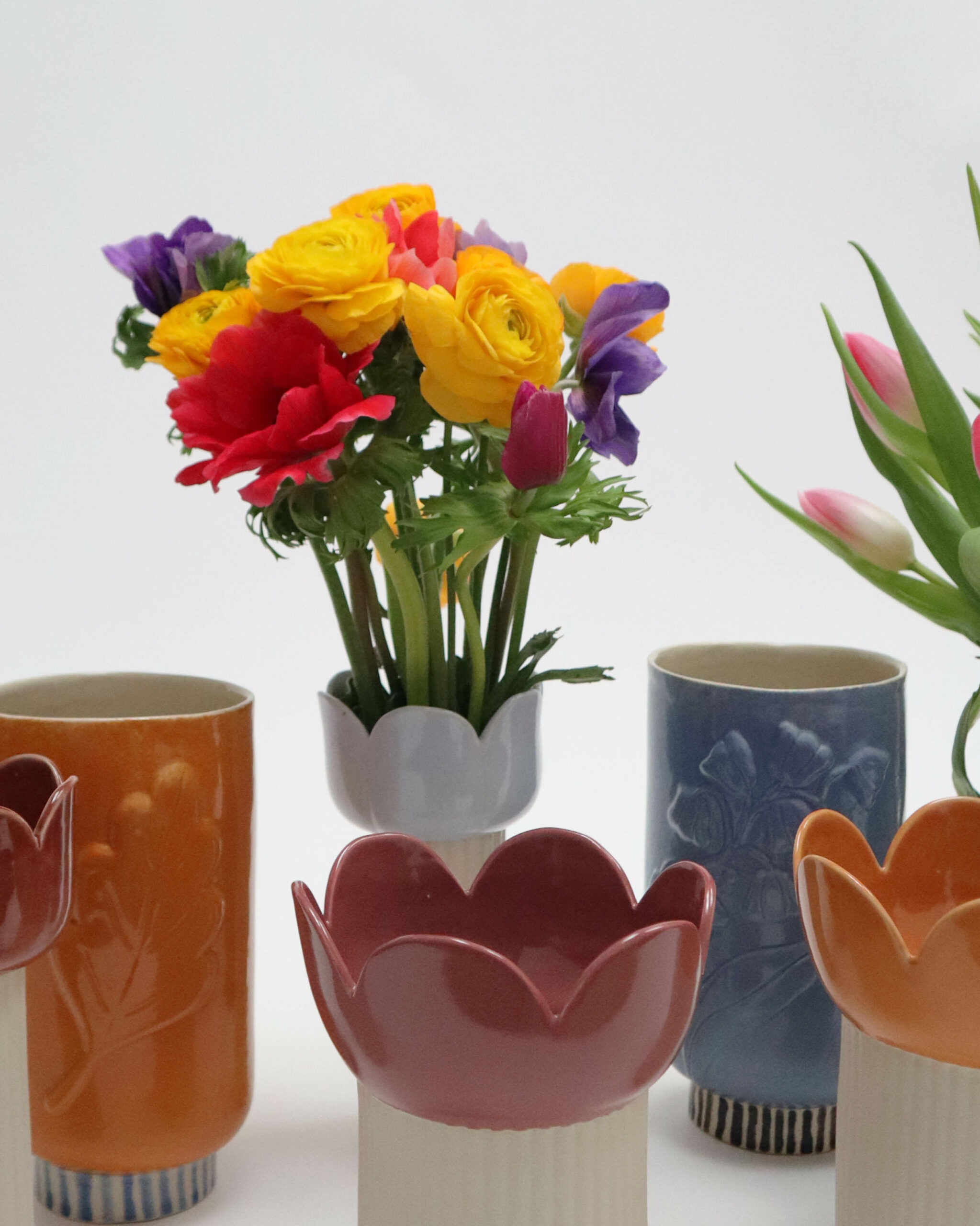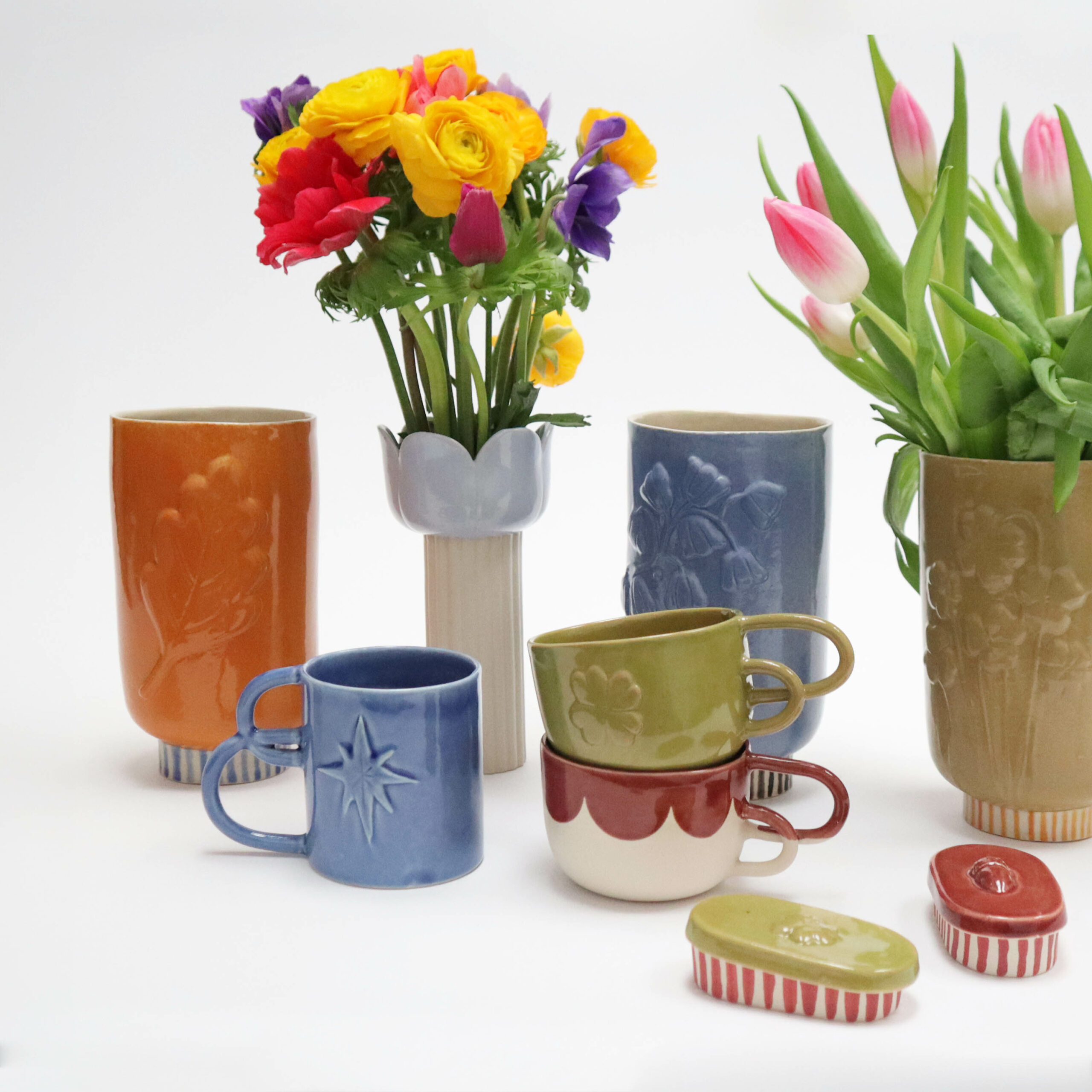 Ce vase élancé présente un bas-relief sculpté à la main, représentant une branche de muguet avec ses délicates clochettes. La teinte Bleu profond met en valeur les volumes et les courbes de la pièce, tandis que le pied rayé marron ajoute un contraste élégant et chaleureux.
