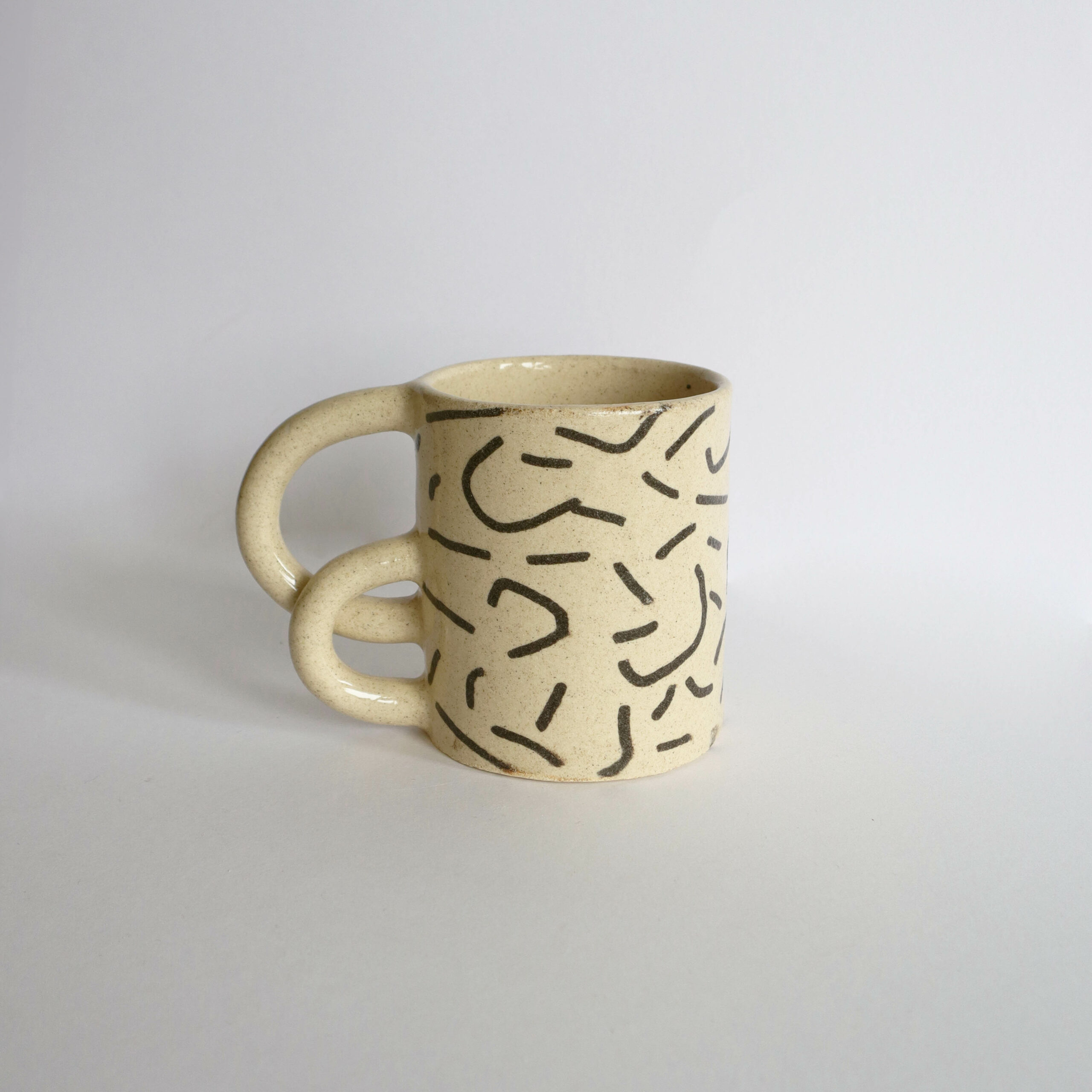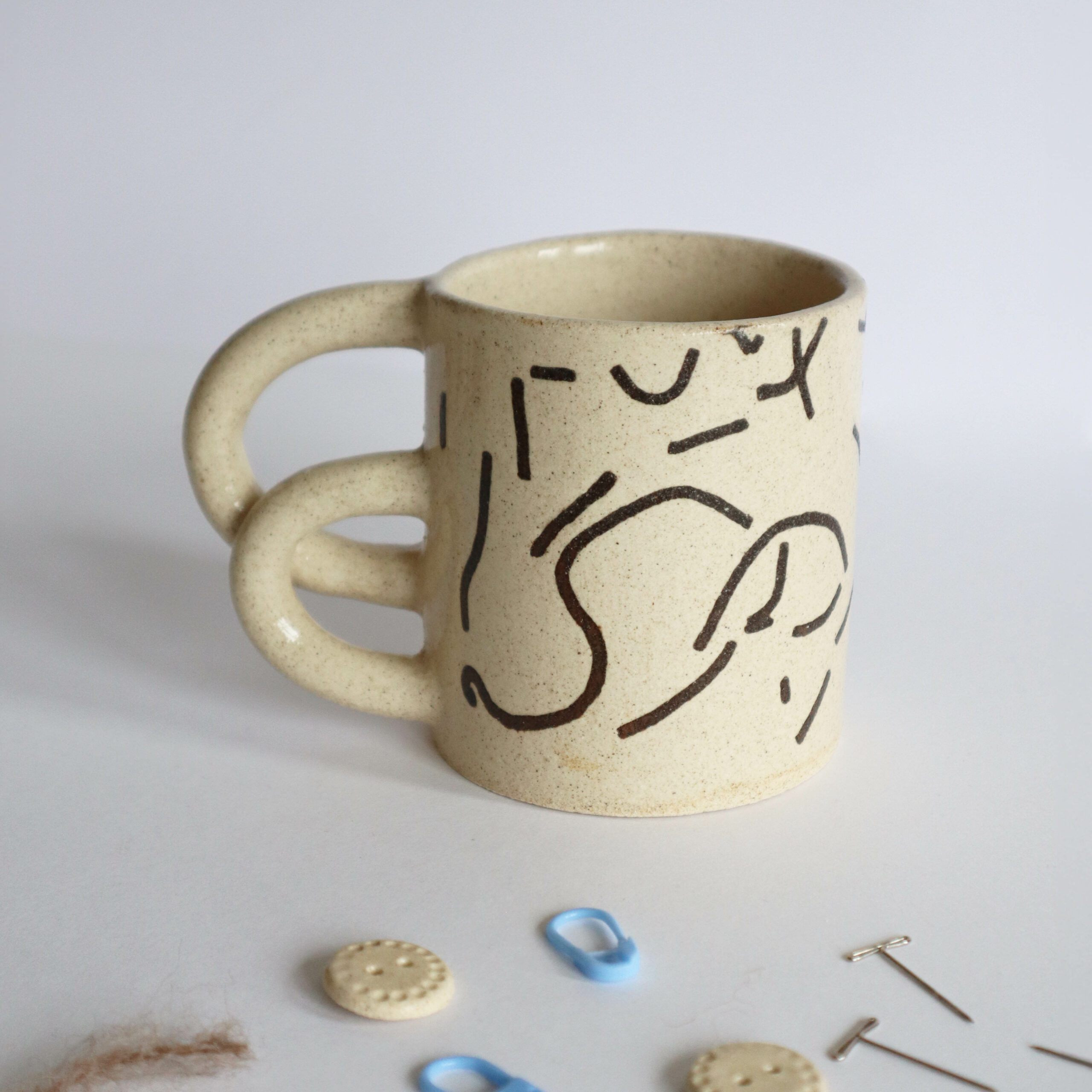 Pour cette édition, je revisite la Super Loop, en modelage à la plaque, avec deux grés : un grès beige qu’on appelle grès vanille et un grès de bourgogne. En travaillant l’incrustation en contraste, cela vient créer ce motif aléatoire, qui me fait penser à des brins de laine 🧶 Chaque tasse est donc unique !
